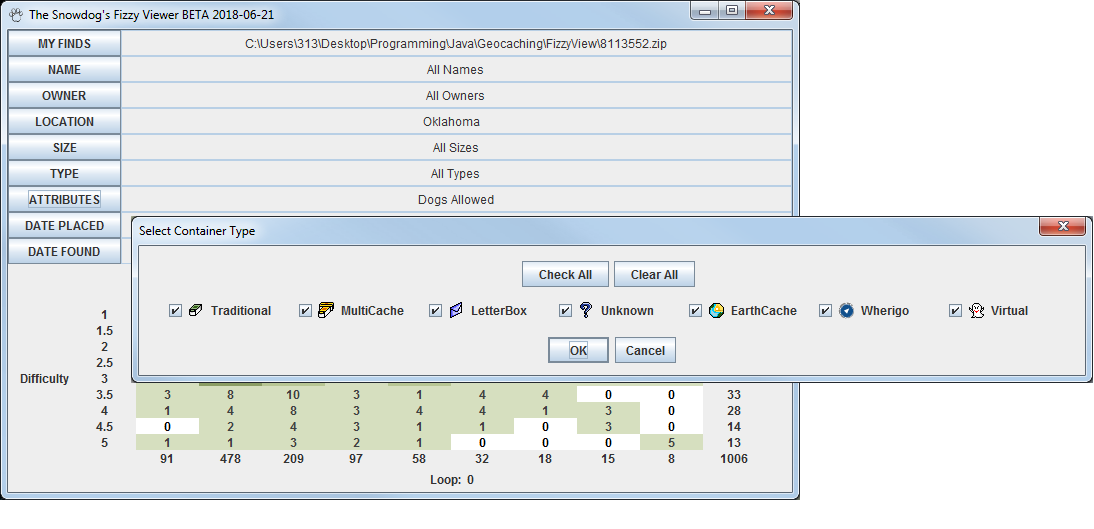 View your "My Finds" file as a D/T grid, filtered by any combination of cache name (search on one or multiple terms), cache owner, locations, sizes, types, attributes, date placed, and date found.